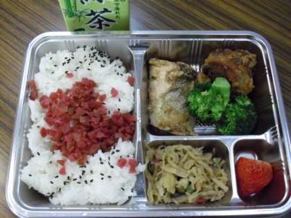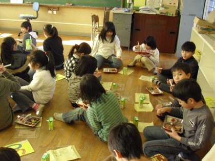 あと2日間だけになった芦花小学校の自校方式の給食です。今日はお弁当給食です。きょうだい学級で食べます。お弁当給食だと配ぜんの必要がないので、たっぷり時間があります。それぞれの場所でみんな楽しそうです。