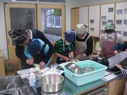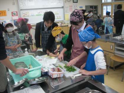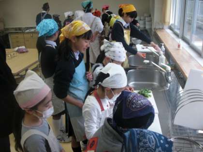 野菜を上手に切れない3年生を中学2年生が、さっとフォローする姿や眼差し、
