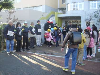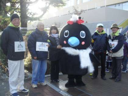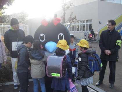 北門でのあいさつ隊に今日は烏山地区キャラクター「からぴょん」が