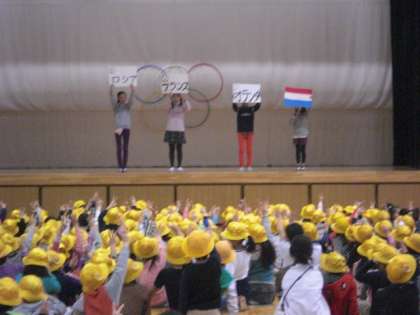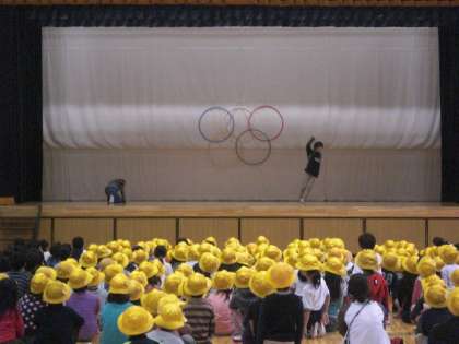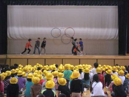 今朝の児童集会は、集会委員会担当の「エアー・オリンピック」でした。