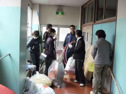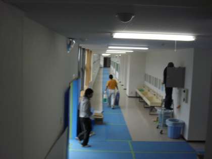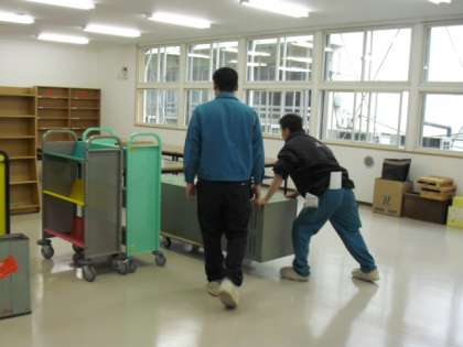 現在仮設校舎へ引っ越し中です。引っ越し業者さんも本当によくやっていただいています。先生方も全員総出で引っ越しです。現在半分ぐらいは移動できたでしょうか。