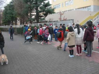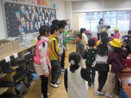”あいさつレンジャー”が出没し、各教室に出向いて(写真:下)