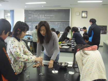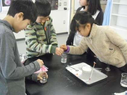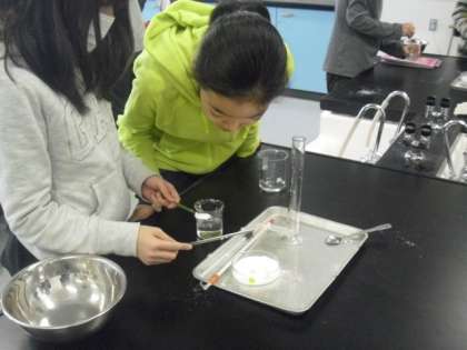 理科室で5年生は、食塩やミョウバンを溶かす実験中です。