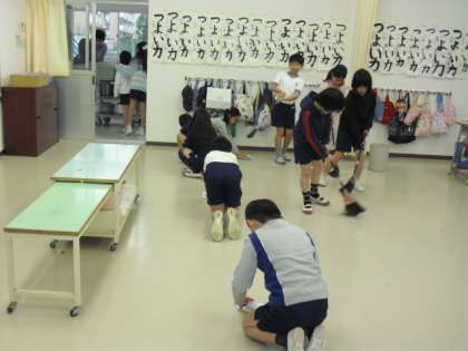 新しい仮設校舎の初めての掃除です。きれいなところをきれいなままで保とうとみんな一生懸命です。靴箱はどのクラスも丁寧に掃除をしていました。靴を出してぞうきんでふいているクラスもありました。