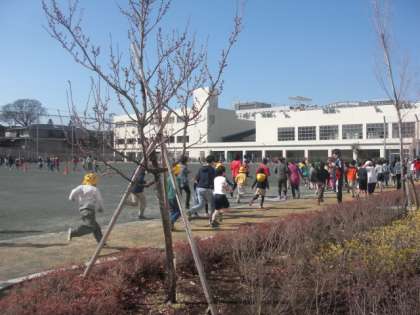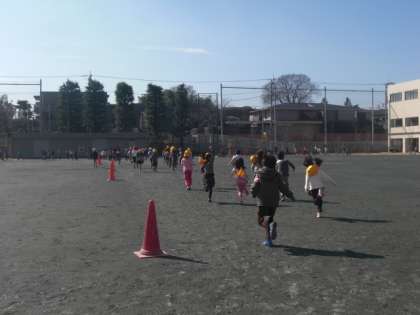 外遊びをしますが、今日は、生々堂々の外遊び、持久走タイムです。