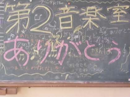 第二音楽室には黒板にたくさんの感謝の気持ちが書かれていました。