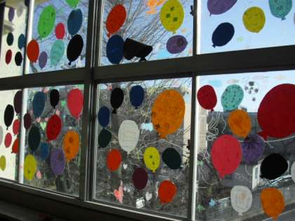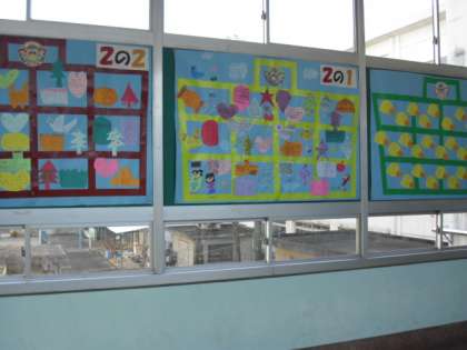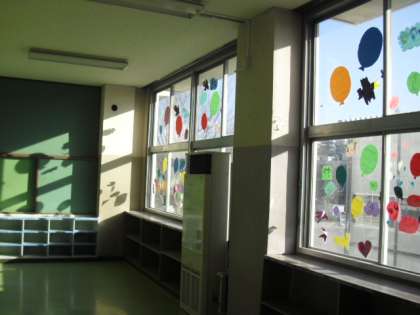 旧校舎は風船と共に大空に飛び立ちます。感謝をこめて作った風船が青空に映えてとてもきれいです。中廊下には全員の感謝の気持ちが並んでいます。