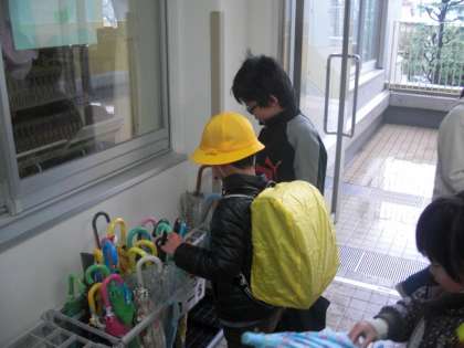 傘の始末や、濡れた靴の下駄箱へのしまい方などの補助を