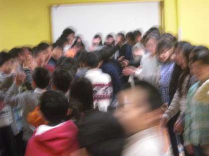 全校朝会から各教室に移動する下級生を