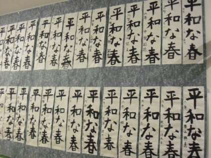 4年生は「美しい空」の「美」と「空」が大きくなって難しいのによくバランスよく納めています。5年生は「豊かな心」の「豊」が大きくならないようにして、とめ、はね、はらいにも気をつけて書いています。6年生の「平和な春」はさすがです。始筆、終筆にも十分配慮をしています。