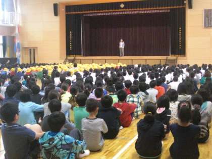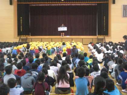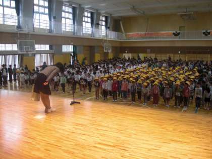 1年生は、黄色い帽子をかぶったまま、朝会に出るのですが、