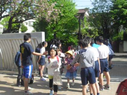 朝、6年生が校門に立って、みんなをお出迎えです。