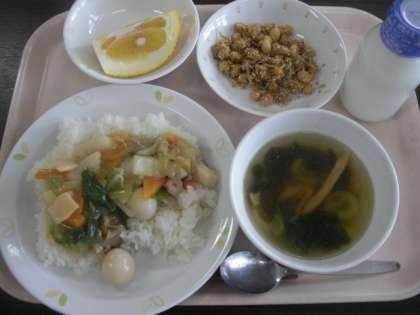 今日は中華丼でした。豚肉やうずら卵、いかやエビ、