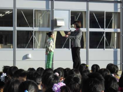 今日の全校朝会では都の作曲コンクールに入選した4年生の表彰を行いました。表彰の後に録音した曲を流しみんなで聞きました。この曲は3年生の時に「花の丘」にコスモスの収穫に行き家に持ち帰ったコスモスを見てできた曲だそうです。何とも言えないやさしい清々しい曲で、コスモスの感じがよく出ていると思いました。お聞かせできないのが残念です。