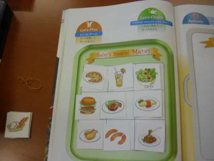英語活動も軌道に乗ってきました。今日は5年生です。3年生の先生とT・Tでの授業です。「what would you like?」という問いに自分なりのカードを選び答えます。