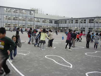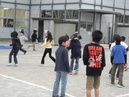 今日の「みんなで楽しく」は、1・3・5年生が校庭で2・4・6年生は教室内です。この時期になると係の活動も活発になり、ほとんど子どもたちだけで運営しています。ラインも自分たちで引きます。早朝の教室の黒板には、子どもたちの字で今日の「みんなでたのしく」の予定が書いてあります。