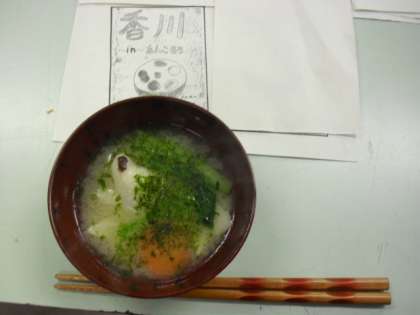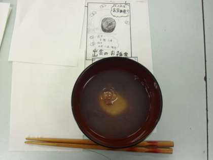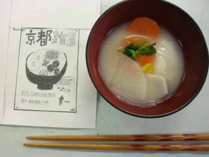 おもちは家庭科専科の海老澤先生が自宅のもちつき機で用意したものです。大きさもちょうどよい一口サイズです。ゆずが飾ってあったり、みつ葉が結んであったりと心遣いを感じます。ただ味わうだけではなく、どうしてお正月にこれを食べるのかという学習もしっかりとしてあるようです。