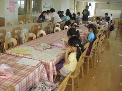 今年度も4〜6年生のクラブ活動の時間を使って、2,3年生の算数教室を開いています。問題に挑戦し、その場で芦花サポーターのお母さんたちに○つけをしてもらって、
