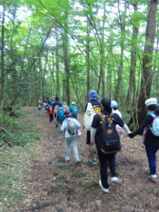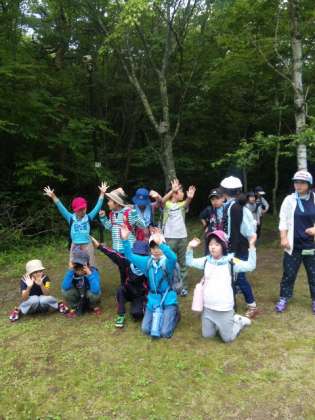 河口湖移動教室2日目は、予定通り進んでいます。森の中をハイキング〜、今、野鳥の森公園に着きました。みんなでやった〜ゴールポーズで記念写真をとりました。