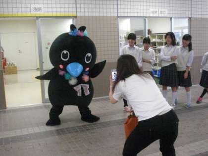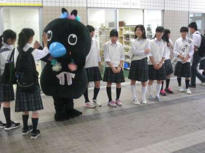 ”からぴょん”は、芦花小学校のあいさつ運動に参加した後、