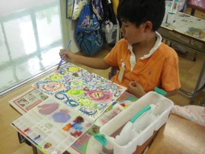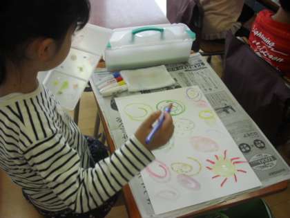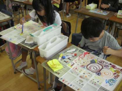 1年生の教室での図工の学習です。絵筆の運びの練習も含めて、いろいろな色の絵の具を使って、ぐるぐる、ぐるーりと描いていました。