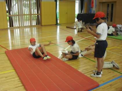 さっそく先日導入されたタブレットで自分の前転の様子を撮影してもらい、