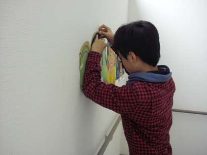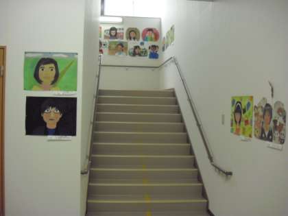 中央階段の1階から3階に6年生の自画像が貼りだされました。2人の6年生が絵を貼るお手伝いをしていました。