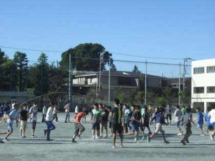 朝の登校を終え、6年生は10月下旬の連合陸上競技大会に向け、長縄の練習に取り組んでいます。