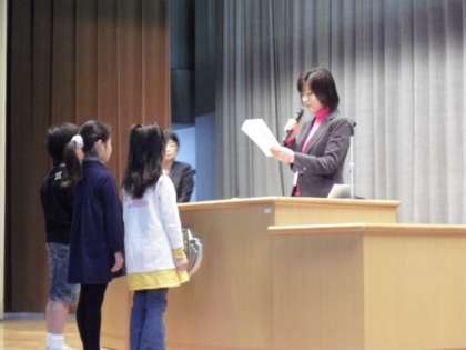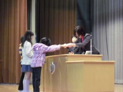 各学級代表の子どもたちが、校長先生から修了証を受け取りました。