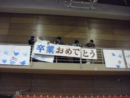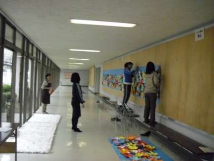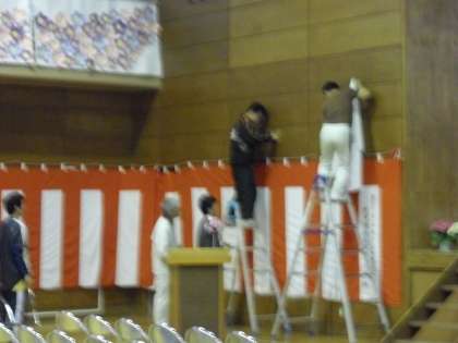 午後は全員で卒業式準備です。中学校の体育館に装飾をします。全員が分担にそってっ協力して取り付けます。