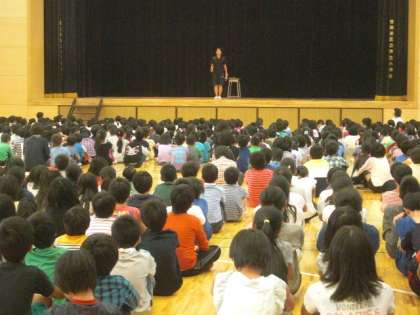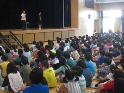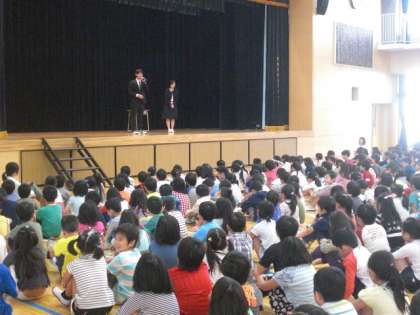 その替わりの先生を校長先生が全児童に紹介しました。(写真:上)