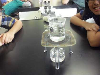 もうしばらく熱すると、ビーカーの底から小さな泡が出てきました。