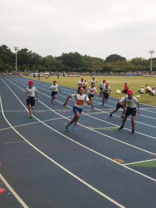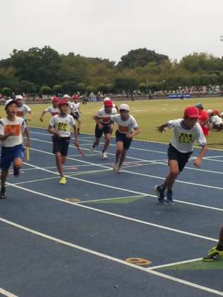 400メートルリレーが始まりました。レースごとの中で1位にゴール〜