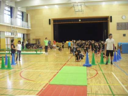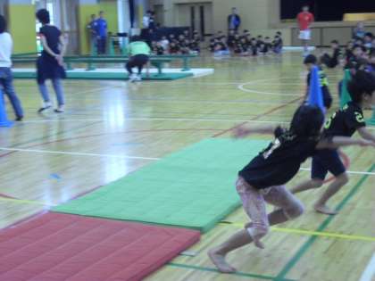 平均台をくぐったり、前転をしたり、跳び箱の山を越えたりと、様々な動きをして走ります。さあ、みんなうまく走り切ることができたでしょうか。