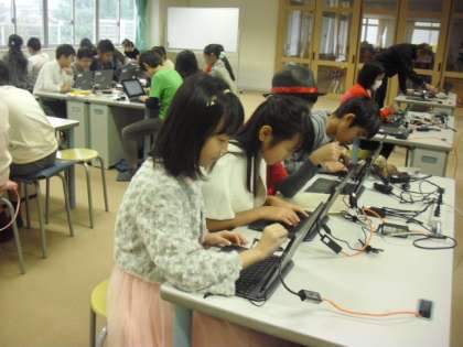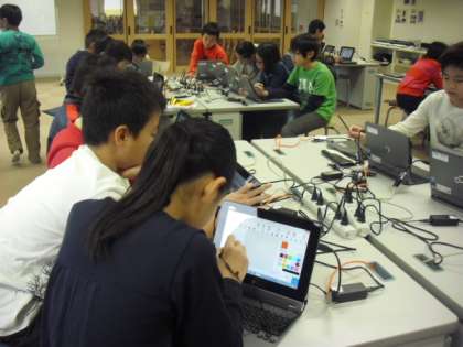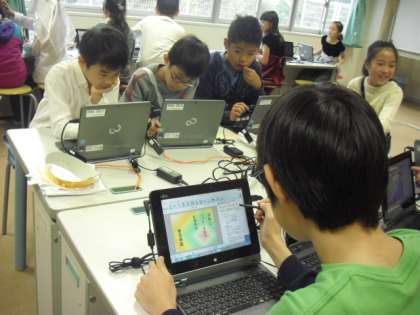 パソコン室では4年生が新しく入ったタブレット型パソコンを使って、秋にちなんだ短歌を作り、挿絵を書き込むなどして作品に仕上げていました。