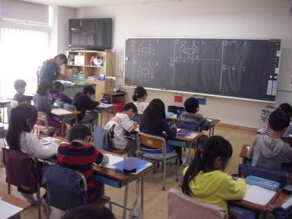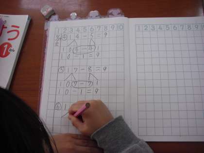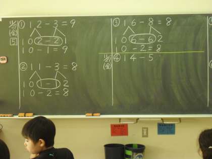 ひき算の計算の仕方は10からひいて、使っていない残りと合わせる方法(減加法)だとわかりやすいのですが、まずひけるものから引いて、さらに残りを10からひく方(減減法)でもできます。今日は減減法作戦で、1年生が問題の答えを求めていました。