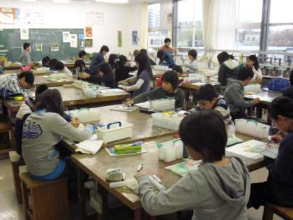 1時間目の図工室は、5年生が学習をしていました。「色と形のかくれんぼ」という題材で、実物の中に自分が描いた物を加え一枚の写真に収めます。自分が選んだ物をのびのびと描いていました。