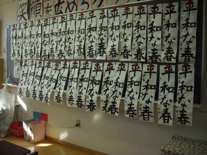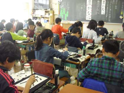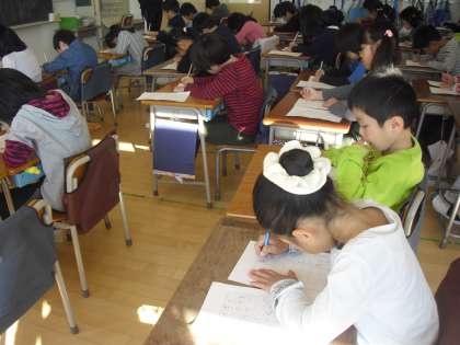低学年は硬筆で、中・高学年は毛筆での書初め・・・しーんとした空気の中、集中して筆を派遣でいました。書きあがった作品を互いに見合ってよいところなど意見を交わしているクラスもありました。