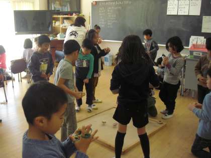 1年生の教室ではお正月遊び・・・こまを上手にまわすこつをうまく回せた友達が、教えてくれました。