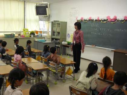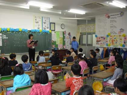 今日は、1年生の担任と校長によるT・Tの授業です。返事の仕方、自己紹介の仕方、休み時間の過ごし方などの勉強をしました。