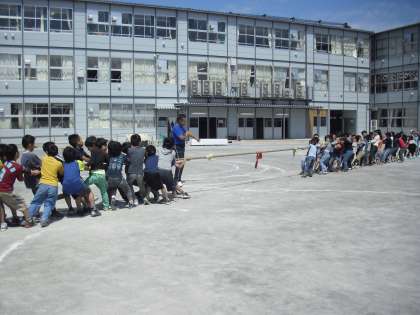 初めの写真、4年生の「疾風トルネード」は並び方から真剣です。2枚目の写真は3年生の「ダッシュでつな引き」です。赤白どちらの作戦が有効でしょうか。3枚目は2年生「つながリーヨ2010」です。ポーズが決まっています。