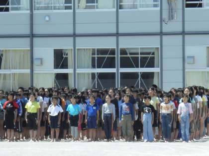 1枚目の写真は1年生のダンスです。難しいステップを上手に踊っています。2枚目の写真は5,6年生の組体操のスタート前です。実は放送機器の調子が悪くてなかなか始まらなかったのです。5,6年生はずっとこのままの姿勢で待ち続けていました。さすがです。