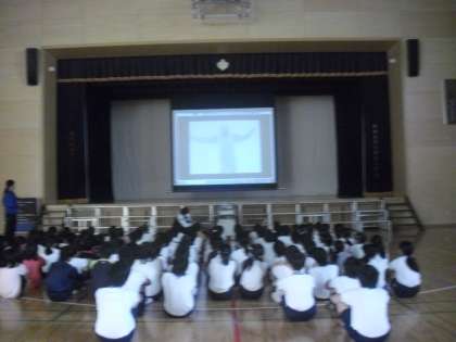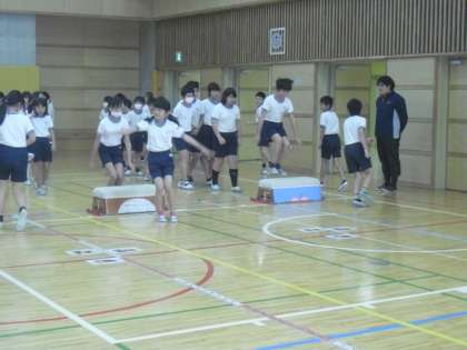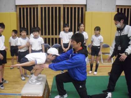 長野オリンピックスキージャンプ団体ラージヒル金メダリストの斉藤浩哉選手をお招きしてのオリンピック教育の学習です。当時のスキージャンプ原田選手、岡部選手、船木選手、斉藤選手の競技映像を観て、スキージャンプに合わせた体の動きにみんなでチャレンジしました。