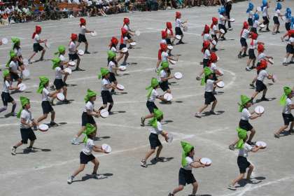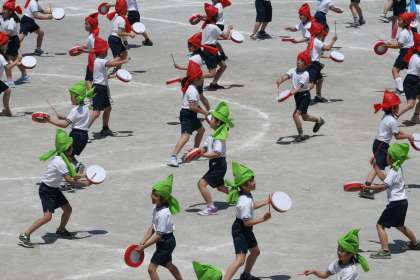 3年生の「エイサー」です。この見事に並んだ隊形と全員が同じ動きをしている様子をご覧ください。リズム感がよく3年生の子どもたちが大好きな踊りでした。
