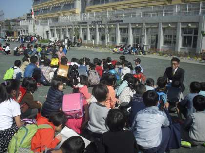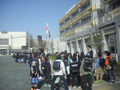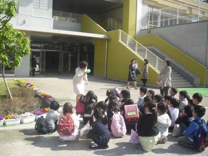 今日は校庭での学級指導です。みんなで先生と一緒に顔合わせ・・・