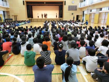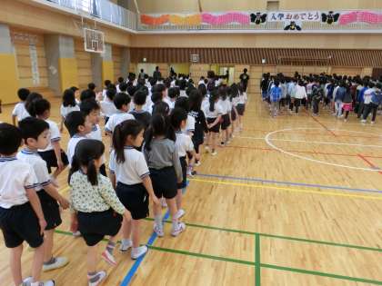 体育館に2年生から6年生までが集合しました。キリッと伸びた背筋! 静かにお話を聞く態度! どの学年もたいへん立派でした。この日は、新たに仲間入りしたお世話になる方々の紹介、週目標の発表、教室へ戻る際の諸注意がありました。行進練習もしっかりと行われ、5月の運動会でもその積み重ねが発揮されることでしょうね。