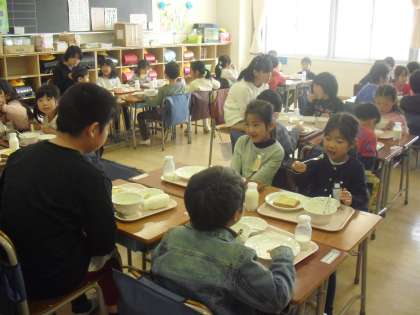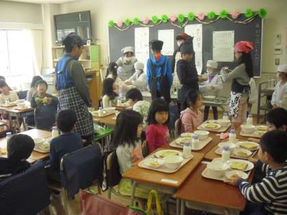1年生の給食が今日から始まりました。給食の準備の仕方、配膳の仕方などを先生に教えてもらって、配膳です。今日は芦花小サポーターのママさんたちが手伝ってくださいました。ありがとうございます。6年生もお手伝いに駆けつけてくれました。お手伝いの6年生と一緒においしい給食をみんなで「いただきま〜す!!」