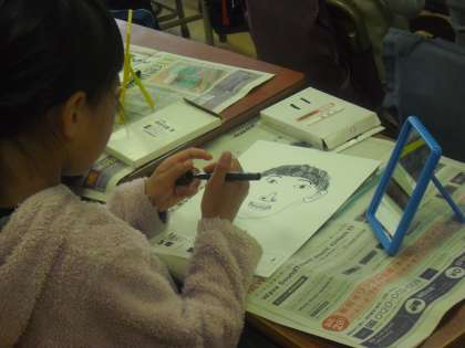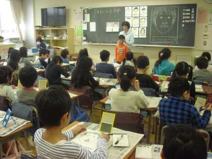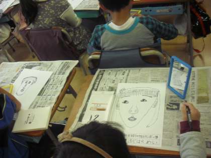 3年生の教室で、鏡をのぞきながら自分の顔を描いていました。輪郭、鼻、目、髪の毛・・・首や肩はどのようにつながっているのかな・・・お友達の体で確かめながら、自分の体についての理解も深めているようです。目の瞳の中まで鏡をのぞき込んで注意深く観察している子どももいました。「どうなっているのかな・・」と不思議発見や追究していく心も大事に育てていきたいです。