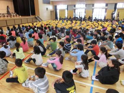 6年生代表3人のメッセージを添えたあいさつから朝会が始まりました。黄色い帽子をかぶった1年生の姿が加わり、今日から文字通りの全校朝会です。