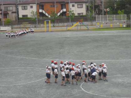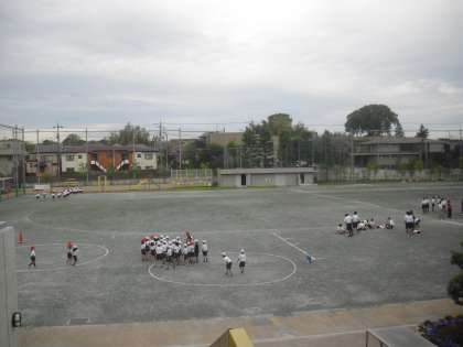 広い校庭では、小学校の違うクラス同士の体育だけではなく、中学生と一緒に使う時もあります。今日も小学校・中学校が同じ時間に、それぞれの活動を展開していました。
